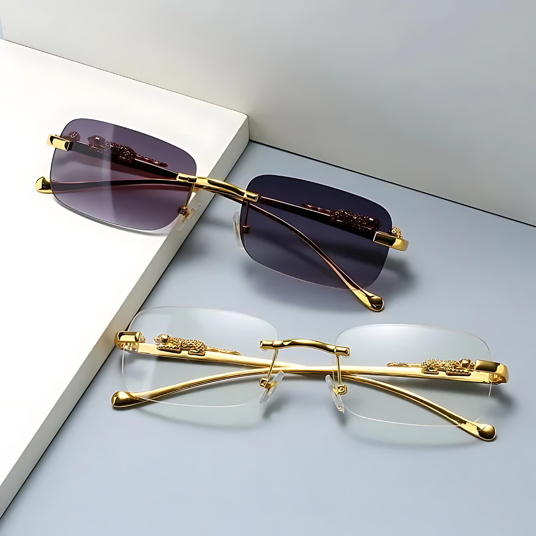Unleash your inner beast with the Eye of the Panther sunglasses- light weight and durable rimless build with a sleek gold panther finish, this piece is a must have this summer!