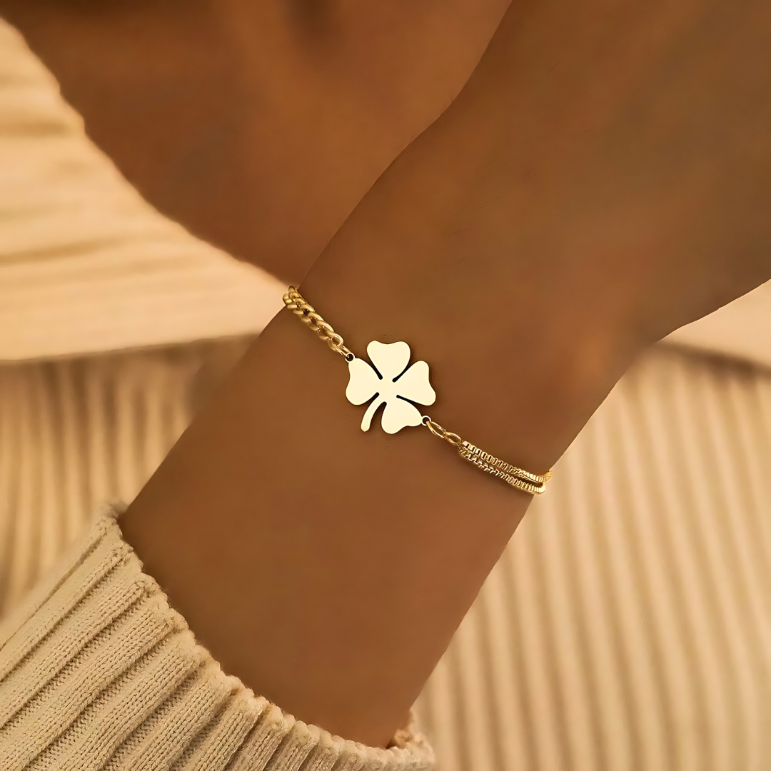 Classic lucky clover bracelet for a touch of timeless charm. Its durable design and lustrous finish make it a perfect accessory for both everyday wear and special occasions.