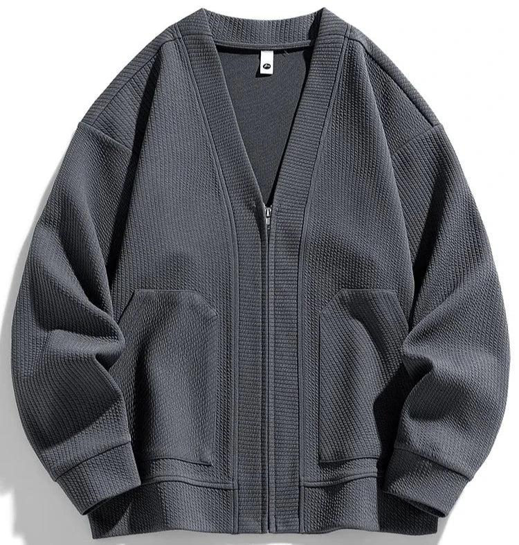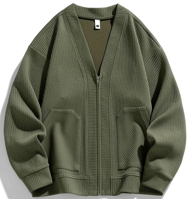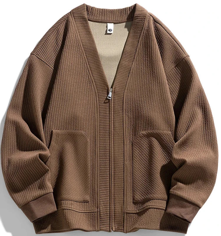 Meet your new fall and winter essential: our textured knit cardigan! With a soft, midweight material and a zippered front, this cardigan offers an easygoing, modern look that's perfect for any occasion. The textured knit design adds a unique touch, making it a standout piece for your wardrobe.