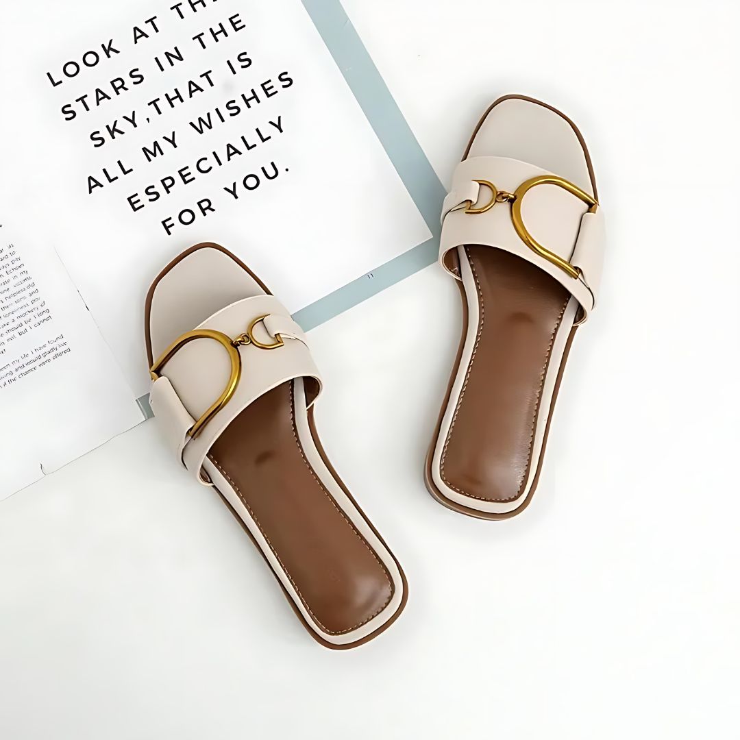 Step into effortless comfort & style with our Reffiné chic leather slides, featuring a sleek gold-tone buckle accent for a touch of elegance and cushioned insole for comfortable all day wear.